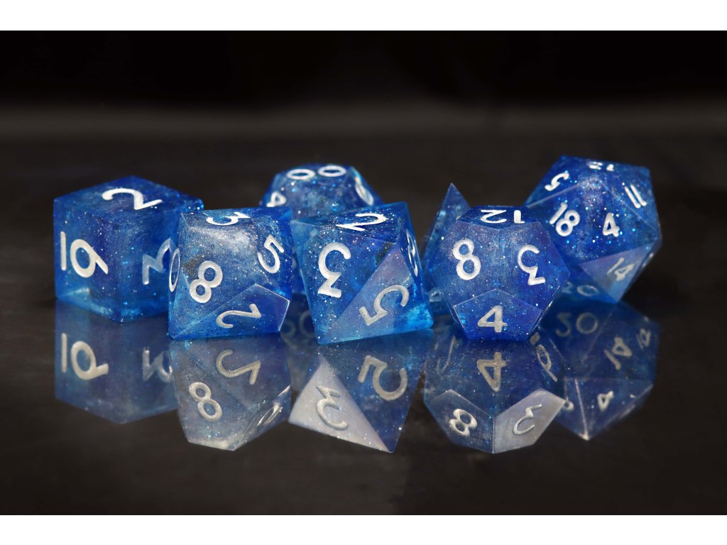 Sedmidílná sada kostek obsahuje kostky: D20, D8, D10, D%, D6, D4 a D12.