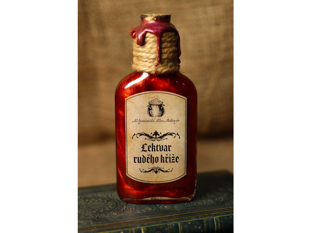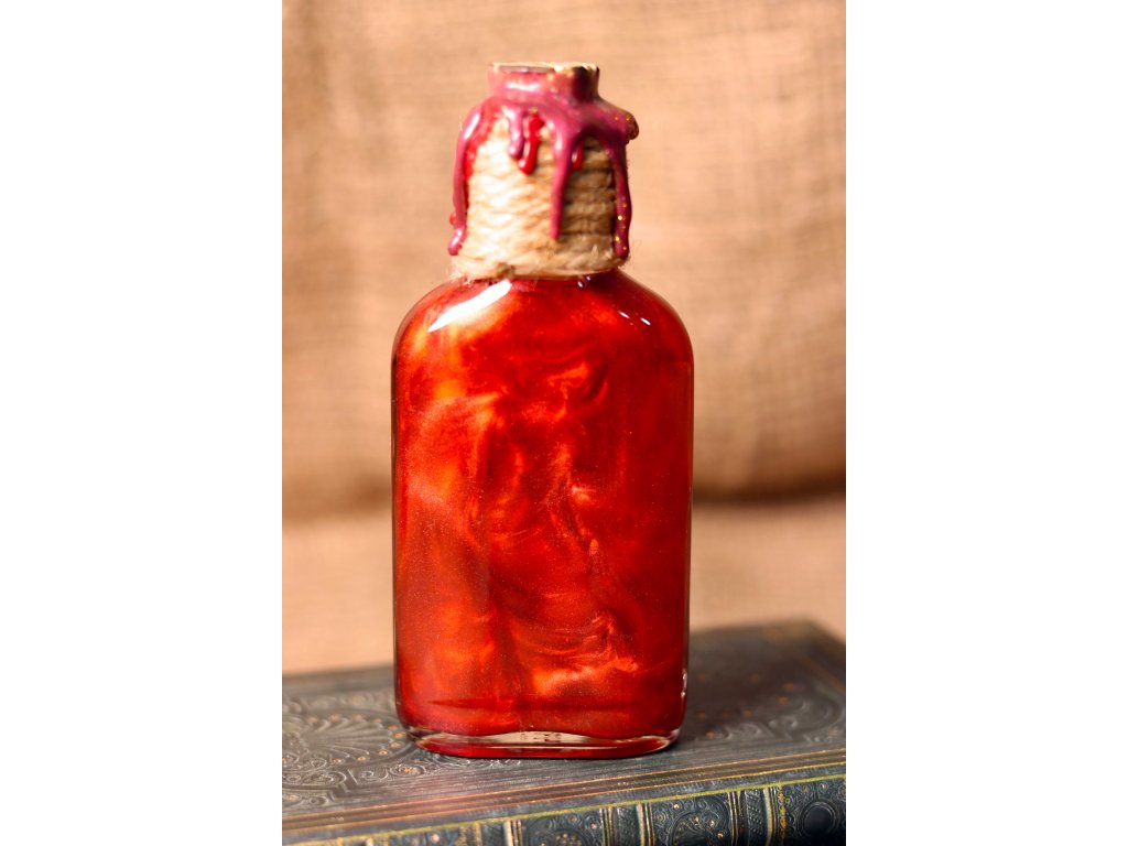 V lahvičce se třpytí hustá rudá tekutina připomínající krev. Při požití se rozlije hřejivé teplo do celého těla a zacelí i ty nejhlubší šrámy.