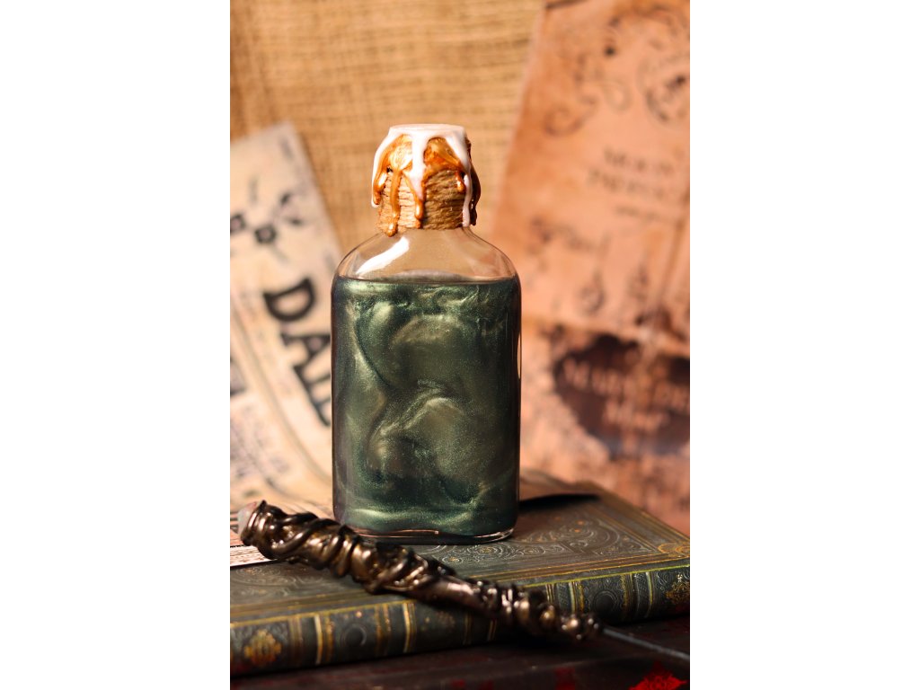 Tento lektvar se proměňuje z vínové barvy na třpytivou zelenou. ✨ Jeho proměnlivé vlastnosti umožňují dočasně převzít fyzický vzhled jiné osoby.