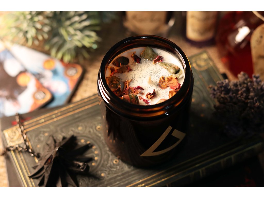 Sójová vonná svíčka zdobená sušenými květinami, třpytkami a minerály se zlatě třpytivou etiketou Igni. Plamen při zapálení tančí a vyzařuje teplo, které probouzí ohnivou sílu a naplňuje prostor energií znamení Igni.