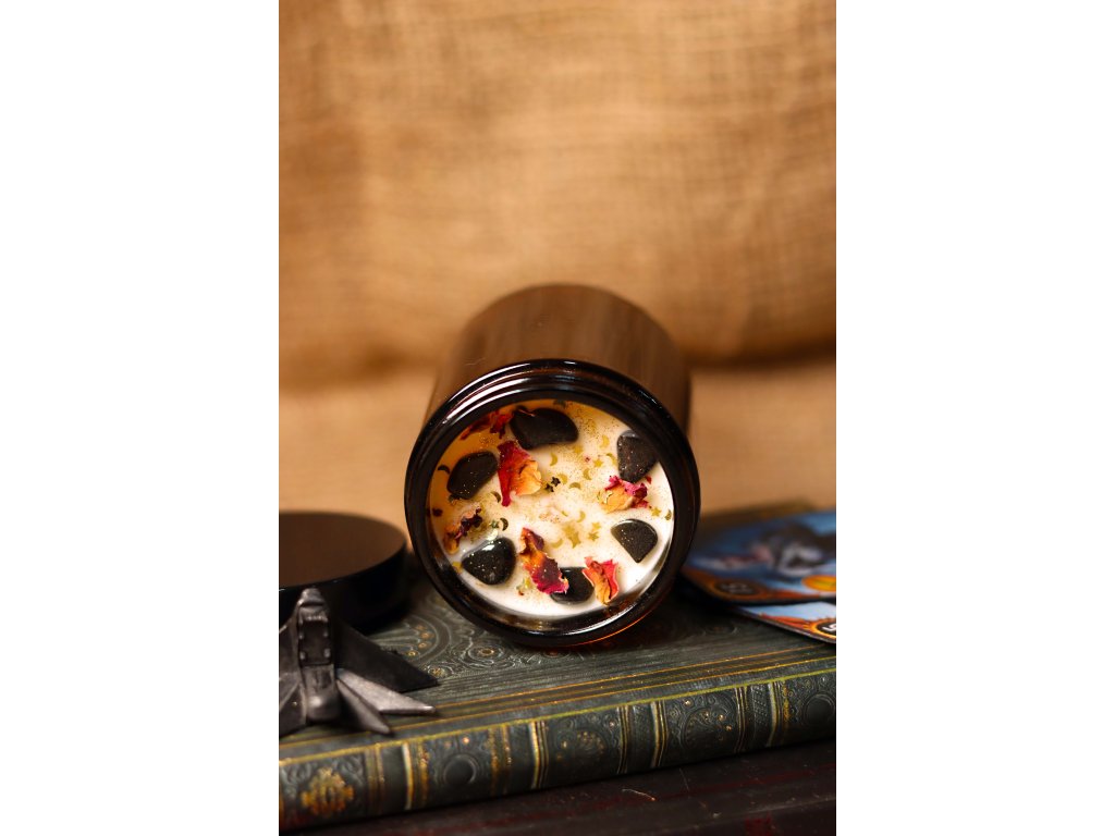 Sójová vonná svíčka zdobená sušenými květinami, třpytkami a minerály. Plamen při zapálení tančí a vyzařuje teplo, které probouzí ohnivou sílu a naplňuje prostor energií znamení Igni.