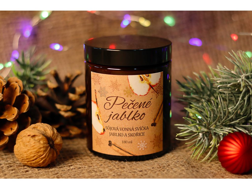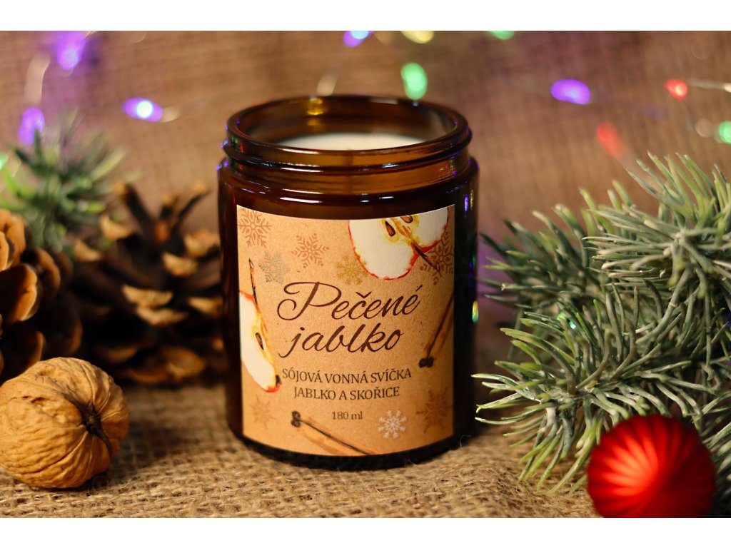 Sójová svíčka Pečené jablko provoní váš domov sladkou vůní zralých jablek, skořice a vanilky. Ručně vyráběná, z přírodního vosku – ideální pro zimní pohodu i jako vánoční dárek.