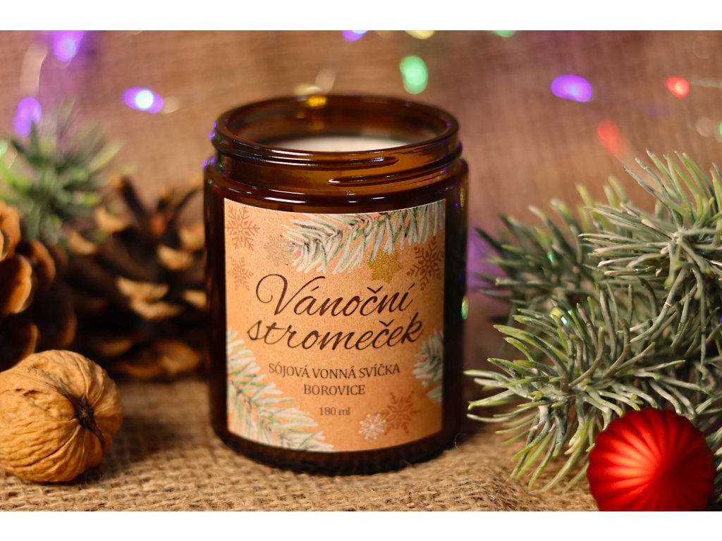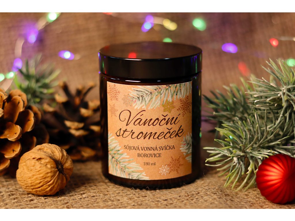Ručně vyráběná sójová svíčka Vánoční stromeček vás zahalí do svěží vůně borového jehličí, dřeva a kapky pryskyřice. Vůně připomíná procházku zasněženým lesem a chvíle klidu u rozsvíceného vánočního stromku.