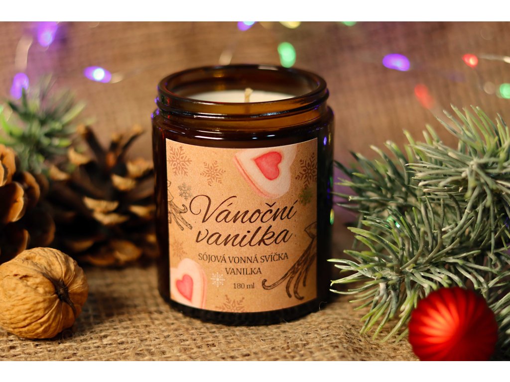 Sójová svíčka Vánoční vanilka provoní váš domov sladkou vůní vanilkových lusků a máslového cukroví. Ručně vyráběná, z přírodního vosku – ideální pro zimní pohodu i jako vánoční dárek.